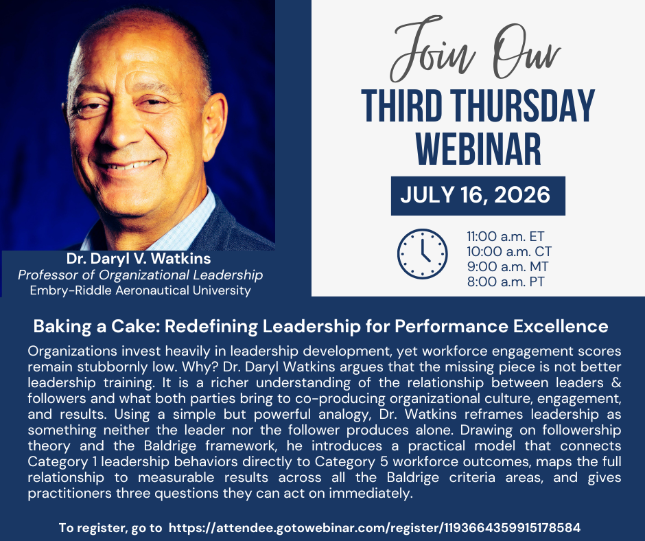 Organizations invest heavily in leadership development, yet workforce engagement scores remain stubbornly low. Why? Dr. Daryl Watkins argues that the missing piece is not better leadership training. It is a richer understanding of the relationship between leaders & followers and what both parties bring to co-producing organizational culture, engagement, and results. Using a simple but powerful analogy, Dr. Watkins reframes leadership as something neither the leader nor the follower produces alone. Drawing on followership theory and the Baldrige framework, he introduces a practical model that connects Category 1 leadership behaviors directly to Category 5 workforce outcomes, maps the full relationship to measurable results across all the Baldrige criteria areas, and gives practitioners three questions they can act on immediately.